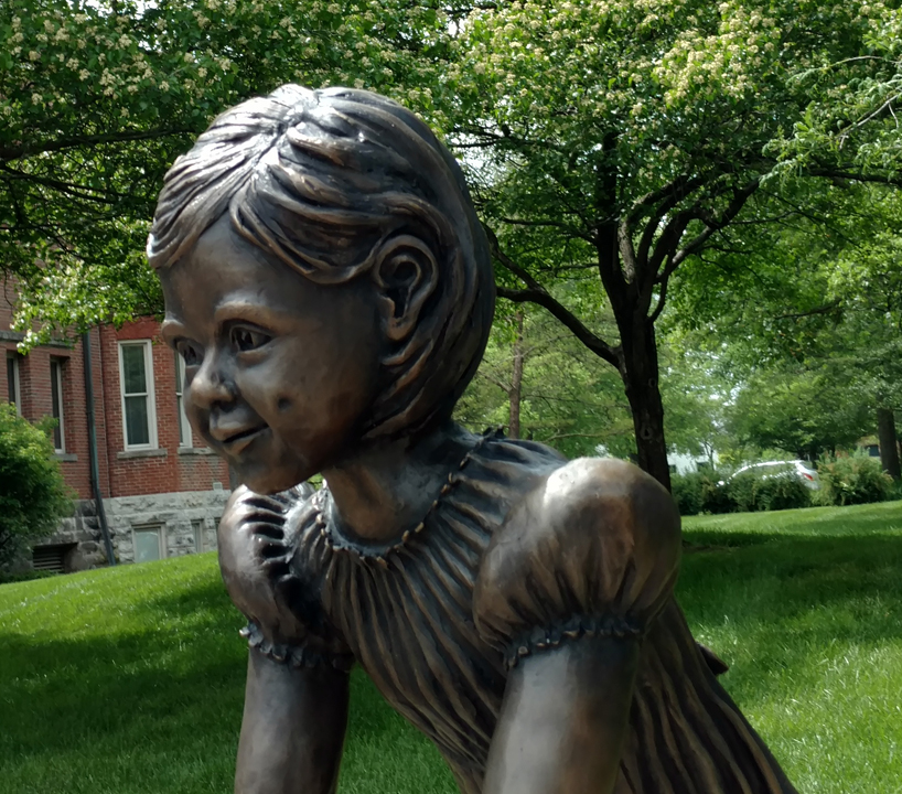 Many years ago, the little girl, Puddles, was stolen from the pond area in front of the building that houses offices of the Bartholomew Consolidated School Corporation. A fund drive was held, and money was raised to pay for the creation and installation of a new sculpture. The new one, now known as Lilly, was created by Columbus artist Linda Peterson, and it's shown here shortly after its installation in May, 2017.