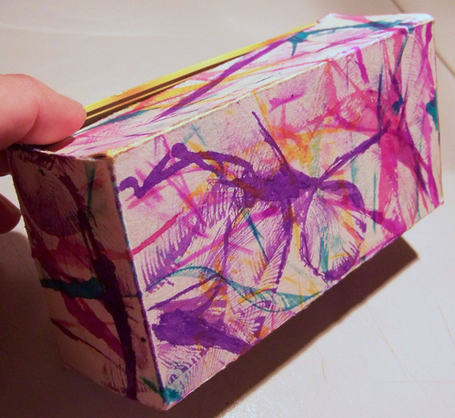 Dip all but two inches of a fourteen-inch length of string into acrylic, poster paint, ink, or watercolor. Lay it across a piece of paper, leaving the "clean" part hang over the edge. Place another paper on top of the first one, and holding your hand on top of the paper and string, pull the string back and forth and then out. Repeat with other colors, if you wish. Be sure to use a clean string for each new color!